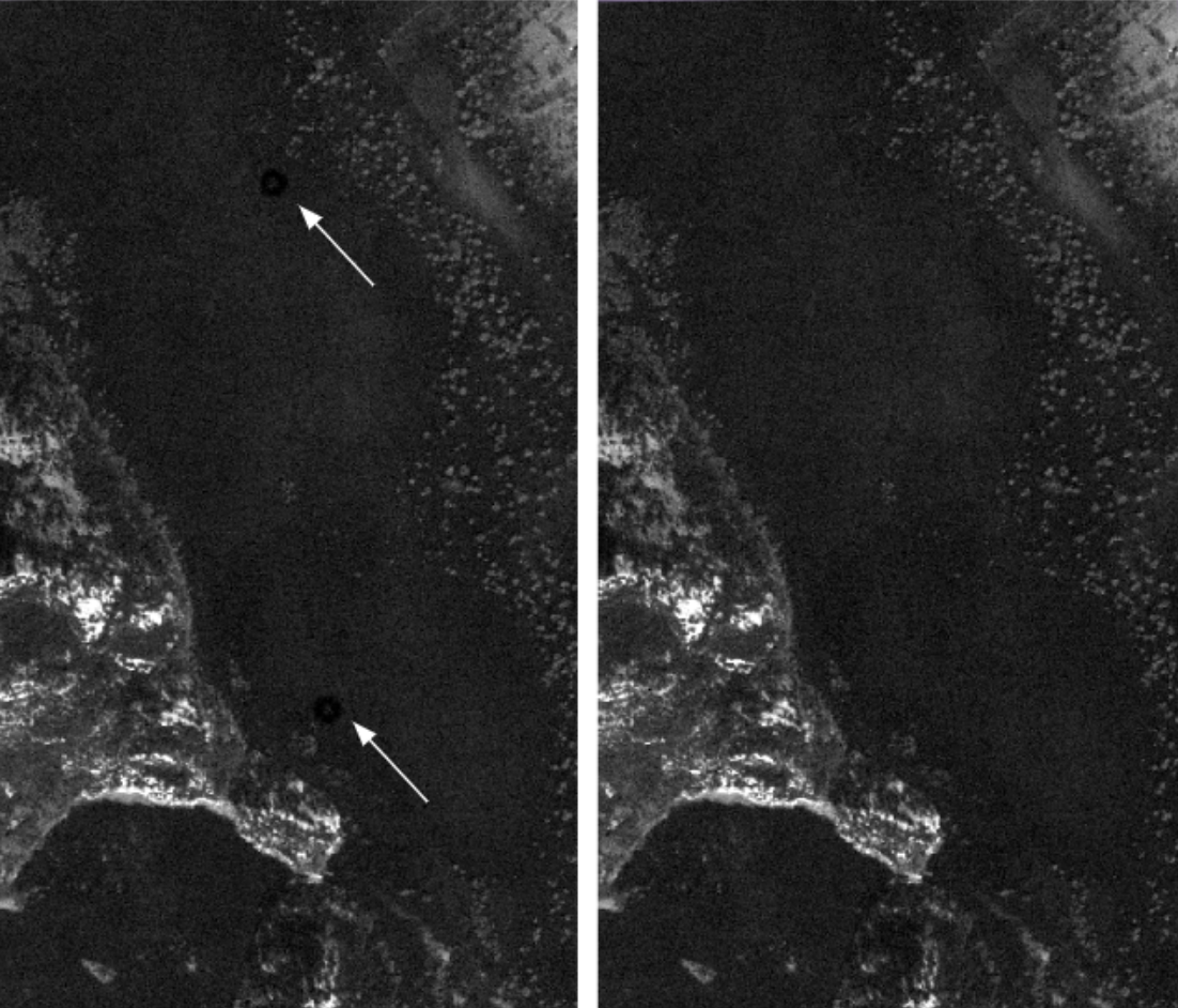 Moving objects, such as vehicles on the ground or in the sea, appear at different positions in different color bands. This feature can be used to determine the object velocity.