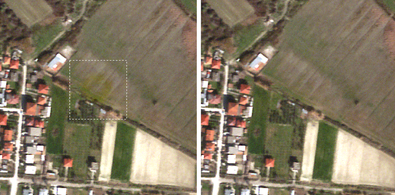 An outdated flat-field frame can infer tonal distortions in the tile center. In the stripe, this is usually noticeable along the track. In a RGB composite, a color artifact will appear. This occurs very rarely (roughly about 2 events per year for the entire fleet), as the flat-field frame is computed frequently (bi-weekly or monthly). This artifact can be corrected by post-processing with an updated flat-field. An example is provided below.