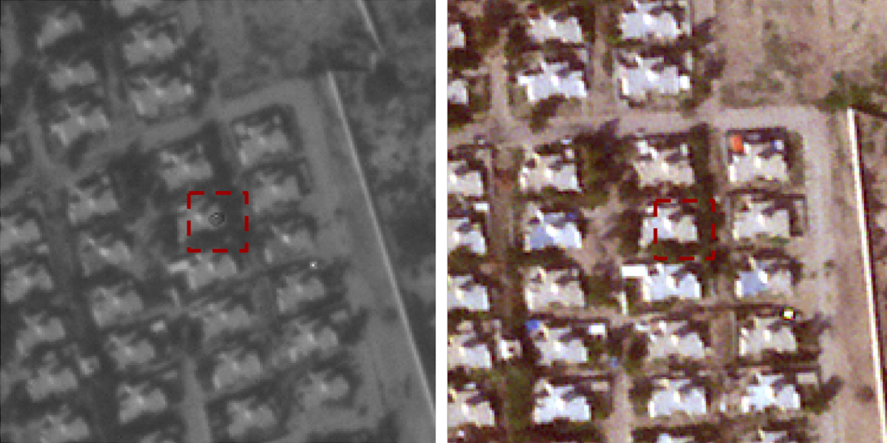 Because of the parallax effect, the tip of very high buildings can also appear at different positions in different bands, as it can be seen in the following image.
