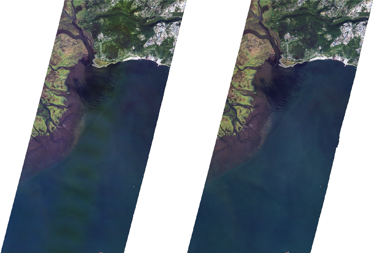 Cloudy images or images with moving objects such as waves may exhibit misalignment effects due to the incorrect alignment of the spectral bands.